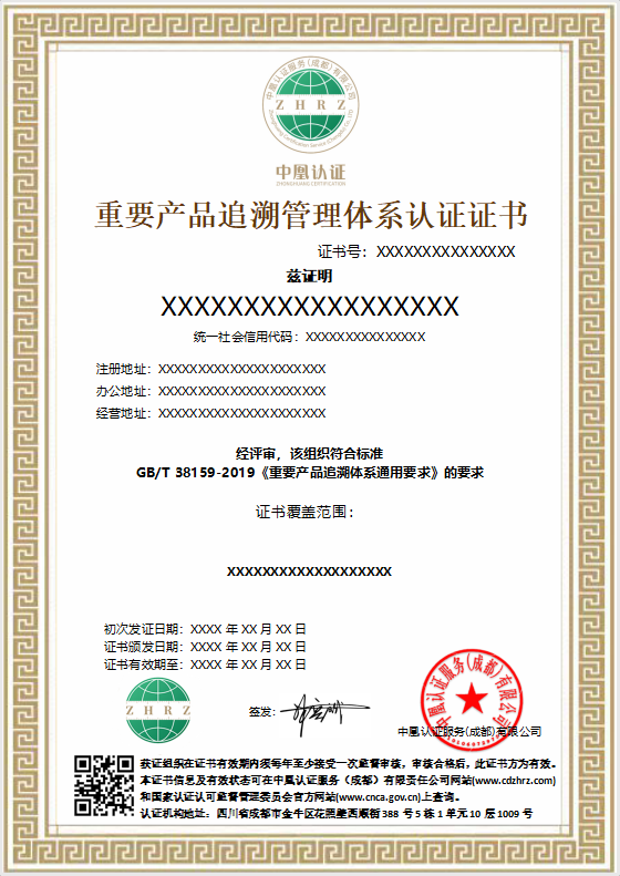 重要产品追溯管理体系认证证书样本