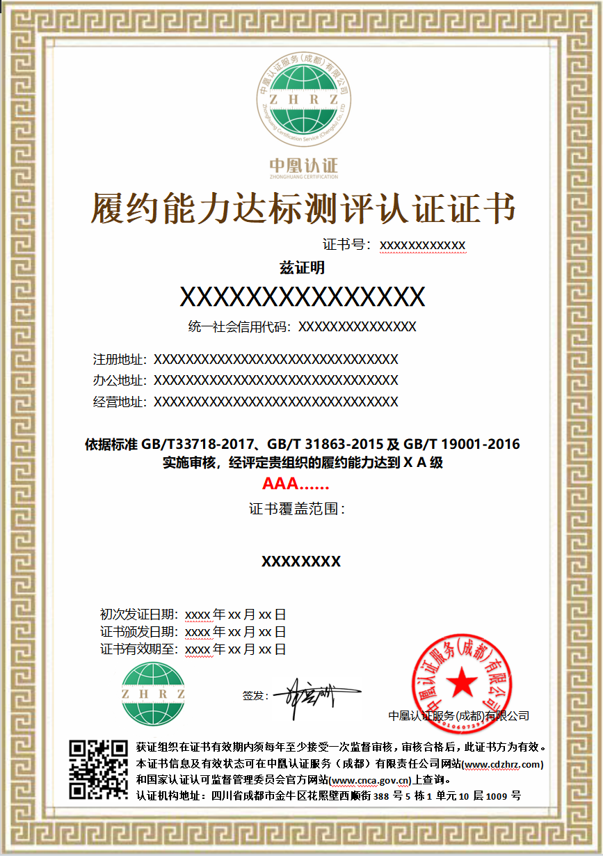 履约能力达标测评认证证书样本