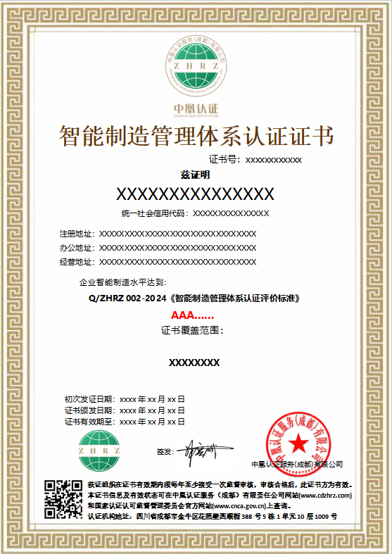 智能制造管理体系认证证书样本