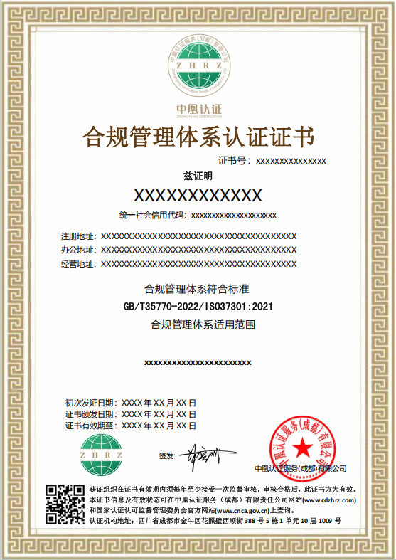 合规管理体系认证证书样本